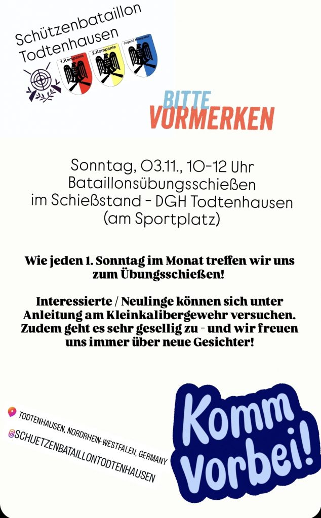 Liebe Todtenhauser, Freunde des Schützenbataillons und der Kompanien, am Sa., 22.02.2025 werden wir wieder unsere beliebte Grünkohlwanderung durchführen. Zu dieser Veranstaltung laden wir alle Angehörigen und Freunde des Schützenbataillons Todtenhausen und der Kompanien recht herzlich ein.Wir treffen uns um 15:30 Uhr am Parkplatz Wegholmer Str. / Diekweg (gegenüber von Jenz GmbH) von wo wir unsere…
